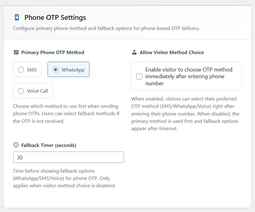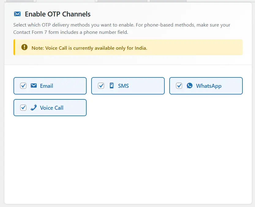 - Support for SMS, WhatsApp, and Voice Call OTP (Voice Call India only)